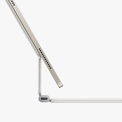 Apple Magic Keyboard подключается к iPad Air через магнитное крепление, обеспечивая надежное соединение и беспроводную зарядку устройства. Это исключает необходимость использования дополнительных кабелей, делая процесс зарядки простым и удобным. Чехол автоматически активируется при подключении и переходит в режим ожидания при отключении, экономя заряд батареи планшета.